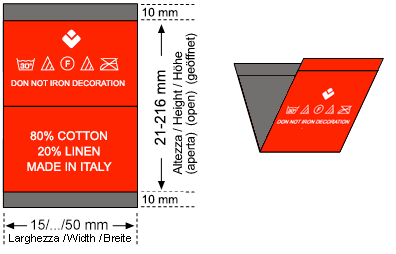 Here you can configure and order your printed textile label online. The price (see toggle menu at the bottom) will instantly be updated as soon as you change important details like the order quantity or properties of the label itself, such as the measurements, the number of colours, the fold type or other criteria. Available as the standard version (black printing on white background) or as CMYK full colour sublimation printing. We are printing on satin.